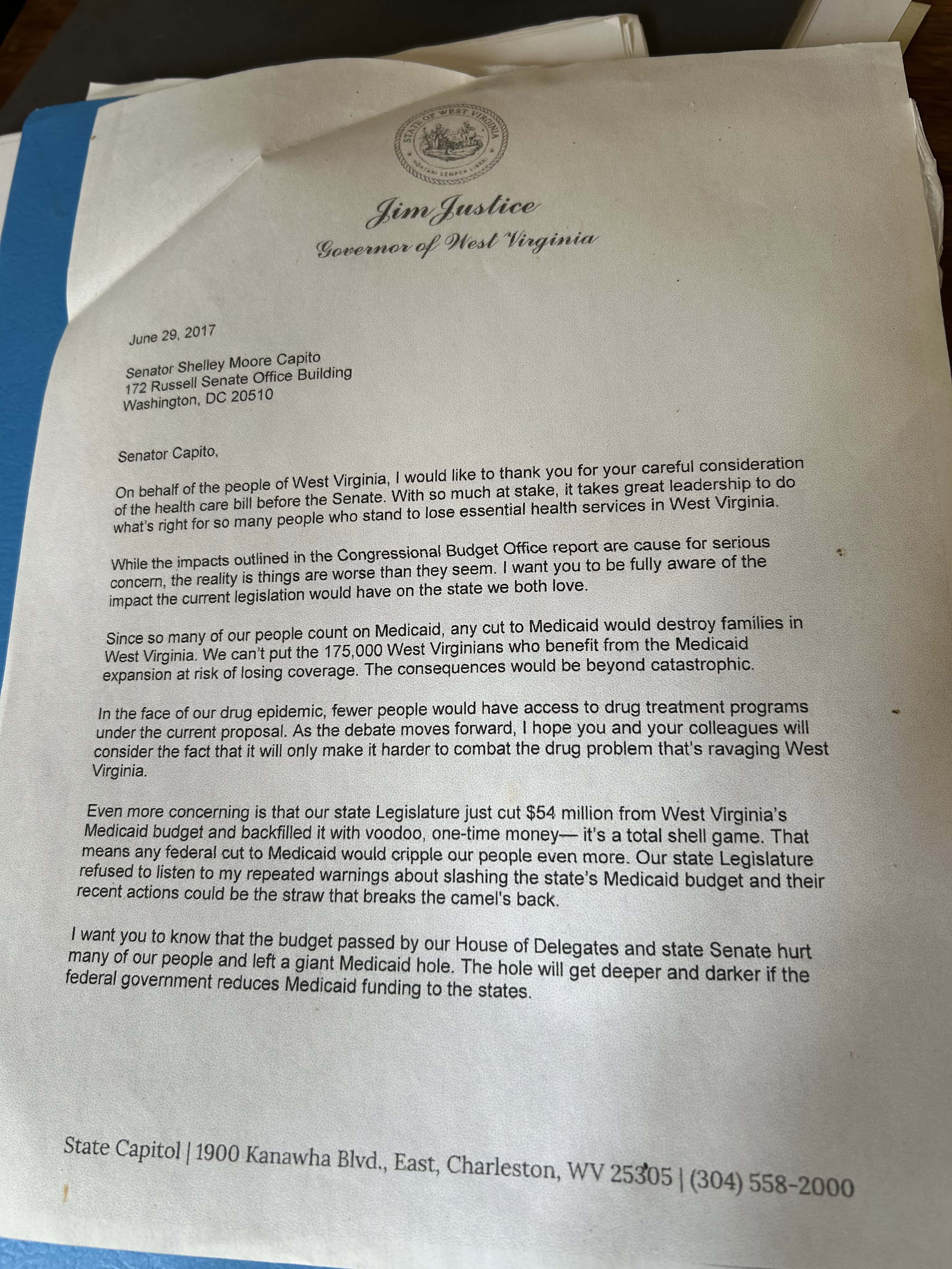 In a June 2017 letter to West Virginia Sen. Shelley Moore Capito, a Republican, Justice wrote: “Since so many of our people count on Medicaid, any cut to Medicaid would destroy families in West Virginia.” He added that “the consequences would be beyond catastrophic.”